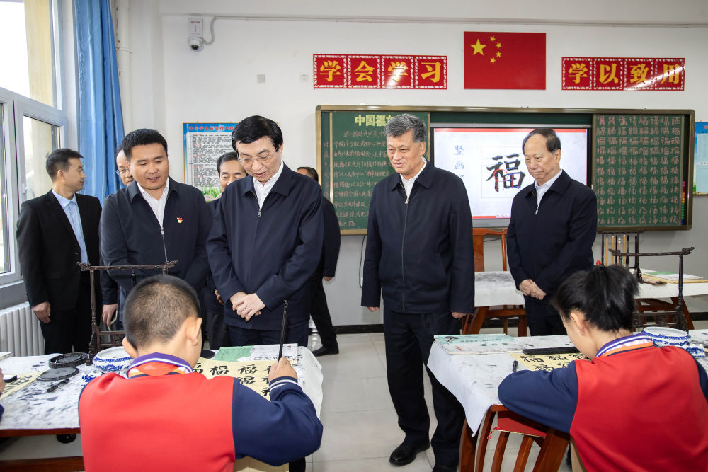 10月21日至24日,中共中央政治局常委、全国政协主席王沪宁在新疆和田、喀什调研。这是23日上午,王沪宁在和田市第十二小学观看书法课堂,了解学校开展民族团结教育情况。新华社记者 李涛 摄