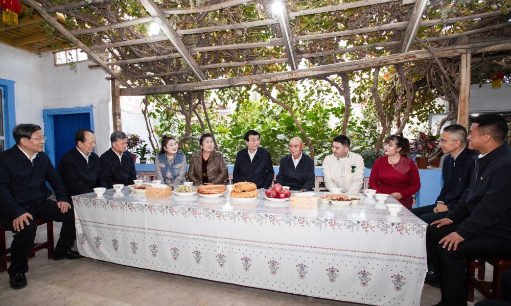 10月21日至24日,中共中央政治局常委、全国政协主席王沪宁在新疆和田、喀什调研。这是23日下午,王沪宁在疏勒县塔孜洪乡台吐尔村同干部群众交流。新华社记者 李涛 摄
