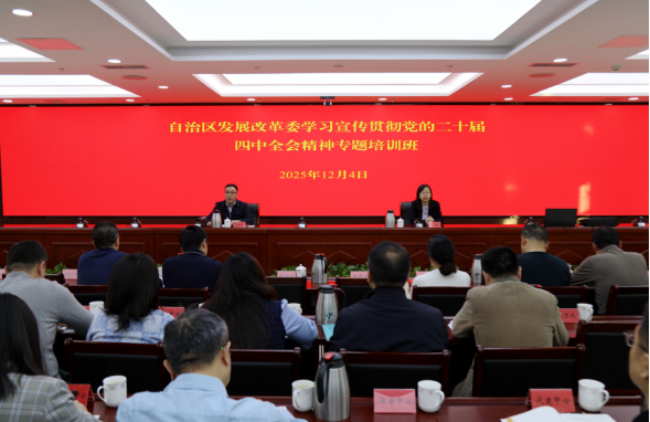 为全面深入学习领会党的二十届四中全会精神,扎实推进学习宣传贯彻工作,教育引导党员干部把思想和行动统一到全会精神上来,12月4日,自治区发展改革委举办深入学习宣传贯彻党的二十届四中全会精神专题培训班。