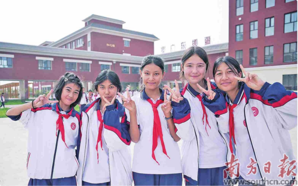 不远处的广州新城实验中学,岭南风和科技范交织的校园,点燃学生们求知的热情。这所学校,由广东援疆投入2.55亿元资金建设,且引入广东名校——广州协和中学全面托管,这一建设托管模式在本批次全国教育援疆实践中属首创。