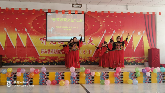 欢歌载舞迎新春,同心联谊聚民心。伴随着欢快旋律和曼妙舞姿,2026年2月15日,尤库日木尕勒(6)村2026年春节文艺演出活动在村民活动中心隆重拉开帷幕。活动现场,驻村第一书记、工作队队长代表工作队和村“两委”,向全村村民群众和党员干部致以诚挚的春节问候与祝福,回顾了过去一年村里基层治理、组织建设、产业发展、民生改善等方面取得的成效,对全体村民群众的辛勤付出和党员干部的担当作为给予高度肯定,并激励大家在马年发扬龙马精神,踔厉奋发、笃行不怠,共同奔赴乡村振兴新征程。整场活动以“家乡味、新风尚、大联欢”为主线,村民群众和党员干部自编自导的歌舞、独唱、器乐演奏等节目轮番上演,充分展现了大家昂扬向上的精神风貌和乡村文化的独特魅力,掌声、笑声、欢呼声此起彼伏,处处洋溢着喜庆祥和的节日氛围,充分体现了各民族群众像石榴籽一样紧紧抱在一起,共同团结奋斗、共同繁荣发展的生动局面。