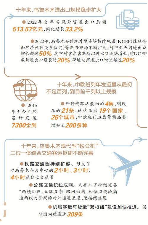 数据显示,十年来,乌鲁木齐进出口规模稳步扩大。2022年全年实现外贸进出口总额513.57亿元,同比增长33.2%。