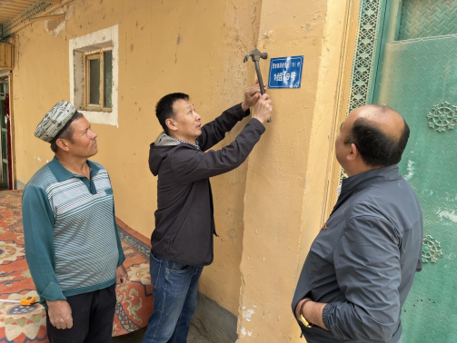 自治区发展改革委驻阔纳巴扎(15)村工作队从制作和安装门牌入手,解决村民急难愁盼的问题,提升村民的幸福感。为确保门牌号信息准确,工作队与村两委干部逐一登记核实村民的住户信息,在与户籍数据比对无误后,按照标准的门牌号尺寸、颜色和材质,为每家农户统一制作了门牌。门牌上清晰的标明村名、组名、房号。2023年4月17日,工作队与村两委干部分成5个小组挨家挨户上门安装门牌。当天,全村8个组的388家农户挂上了统一的门牌号。