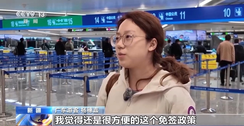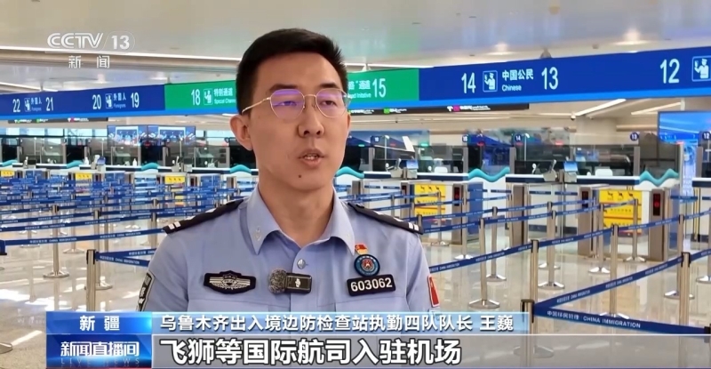 新疆乌鲁木齐出入境边防检查站执勤四队队长王巍:在免签效应的带动下,今年又有斯卡特、飞狮等国际航司入驻机场,并加密了乌鲁木齐往返哈萨克斯坦的航班,目前每周往返航班保持在50架次左右,同比增长43%。